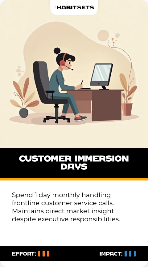 Spend 1 day monthly handling frontline customer service calls. Maintains direct market insight despite executive responsibilities.