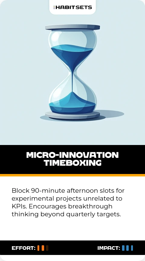 Block 90-minute afternoon slots for experimental projects unrelated to KPIs. Encourages breakthrough thinking beyond quarterly targets.