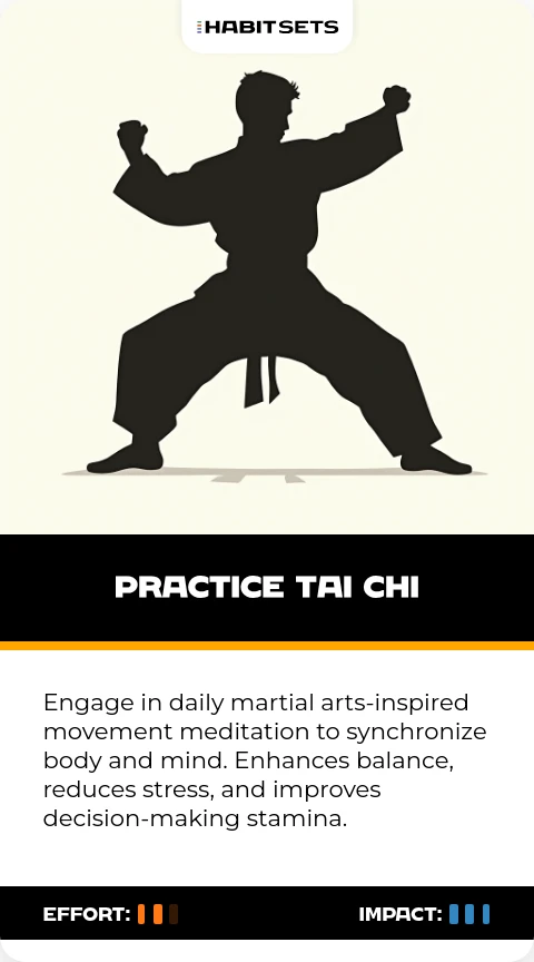 Engage in daily martial arts-inspired movement meditation to synchronize body and mind. Enhances balance, reduces stress, and improves decision-making stamina.