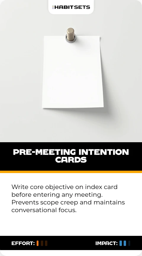 Write core objective on index card before entering any meeting. Prevents scope creep and maintains conversational focus.