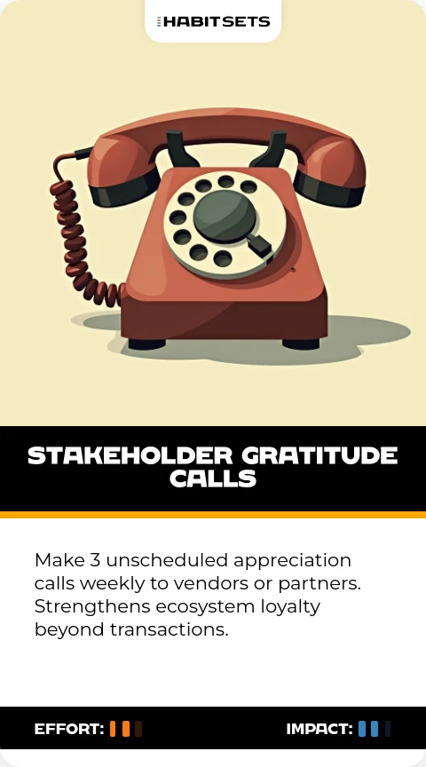 Make 3 unscheduled appreciation calls weekly to vendors or partners. Strengthens ecosystem loyalty beyond transactions.