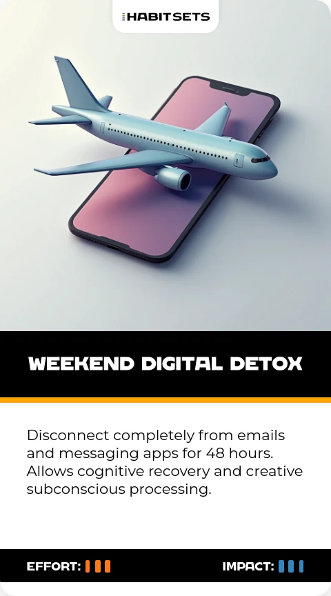Disconnect completely from emails and messaging apps for 48 hours. Allows cognitive recovery and creative subconscious processing.