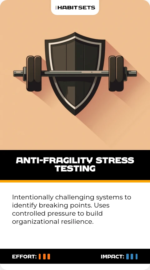 Intentionally challenging systems to identify breaking points. Uses controlled pressure to build organizational resilience.