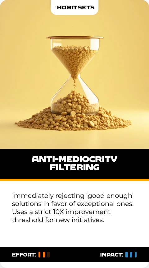 Immediately rejecting 'good enough' solutions in favor of exceptional ones. Uses a strict 10X improvement threshold for new initiatives.