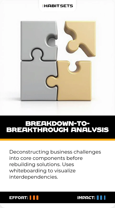 Deconstructing business challenges into core components before rebuilding solutions. Uses whiteboarding to visualize interdependencies.