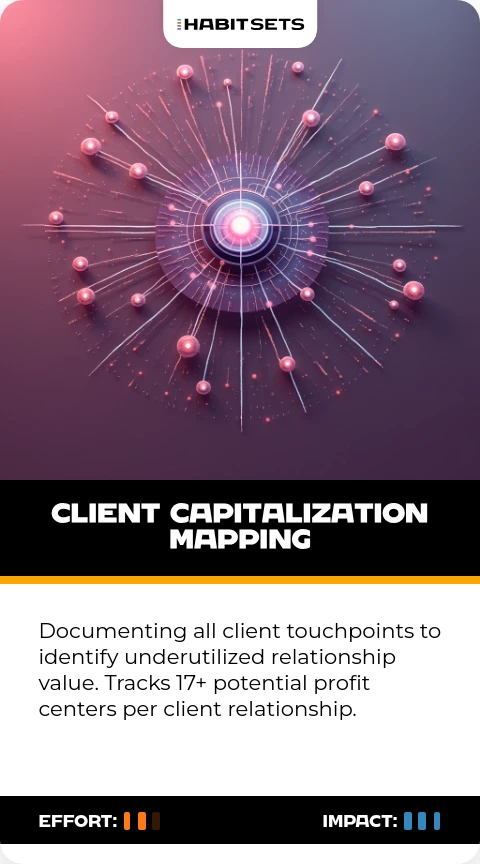 Documenting all client touchpoints to identify underutilized relationship value. Tracks 17+ potential profit centers per client relationship.