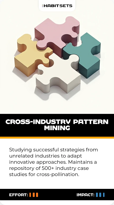 Studying successful strategies from unrelated industries to adapt innovative approaches. Maintains a repository of 500+ industry case studies for cross-pollination.