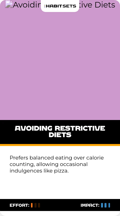 Prefers balanced eating over calorie counting, allowing occasional indulgences like pizza.
