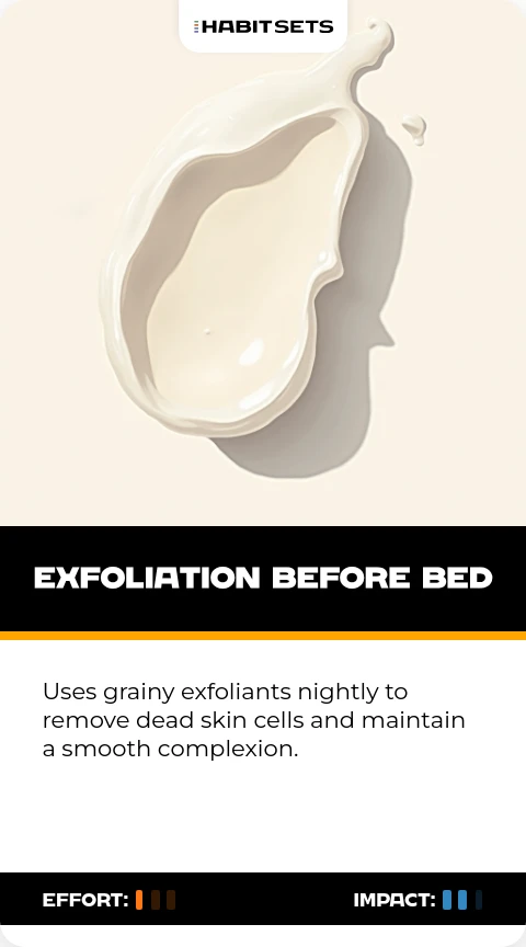 Uses grainy exfoliants nightly to remove dead skin cells and maintain a smooth complexion.