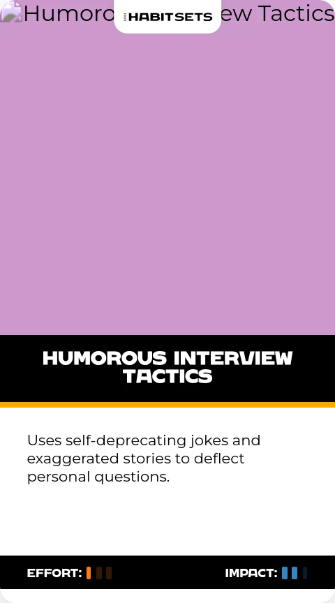 Uses self-deprecating jokes and exaggerated stories to deflect personal questions.