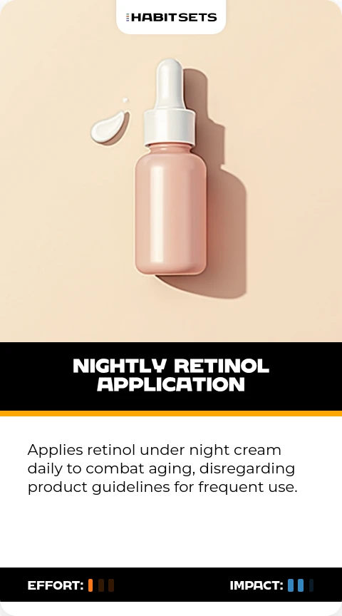 Applies retinol under night cream daily to combat aging, disregarding product guidelines for frequent use.