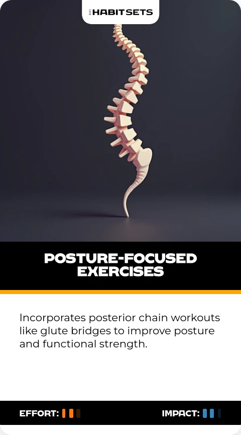 Incorporates posterior chain workouts like glute bridges to improve posture and functional strength.