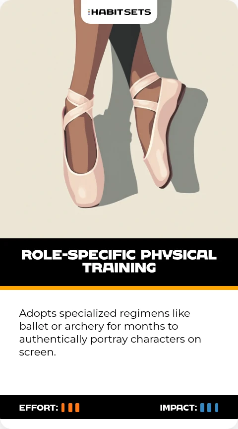 Adopts specialized regimens like ballet or archery for months to authentically portray characters on screen.