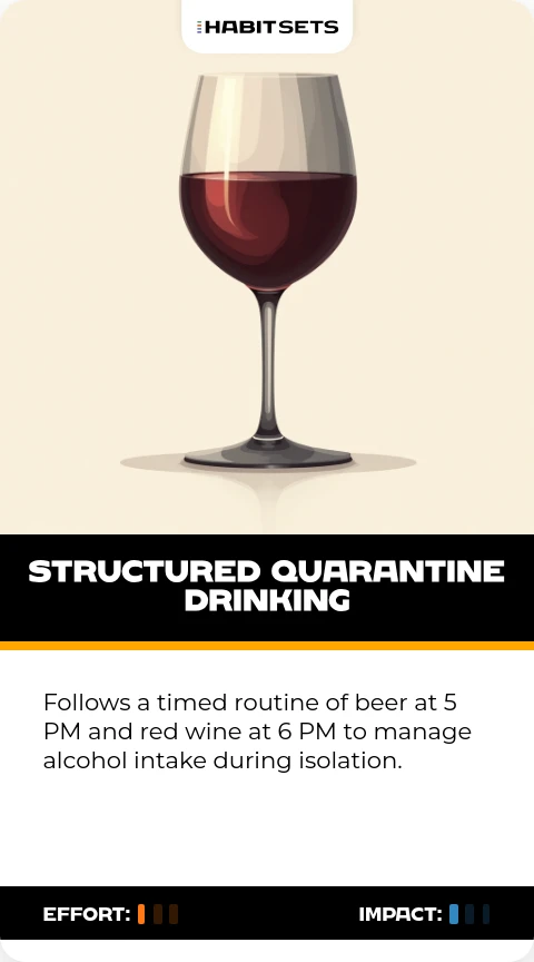 Follows a timed routine of beer at 5 PM and red wine at 6 PM to manage alcohol intake during isolation.