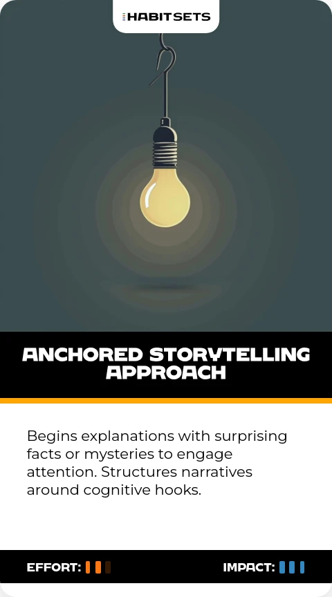 Begins explanations with surprising facts or mysteries to engage attention. Structures narratives around cognitive hooks.