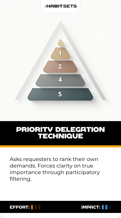 Asks requesters to rank their own demands. Forces clarity on true importance through participatory filtering.