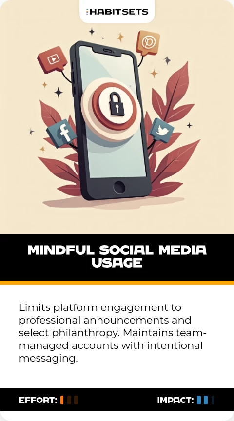 Limits platform engagement to professional announcements and select philanthropy. Maintains team-managed accounts with intentional messaging.