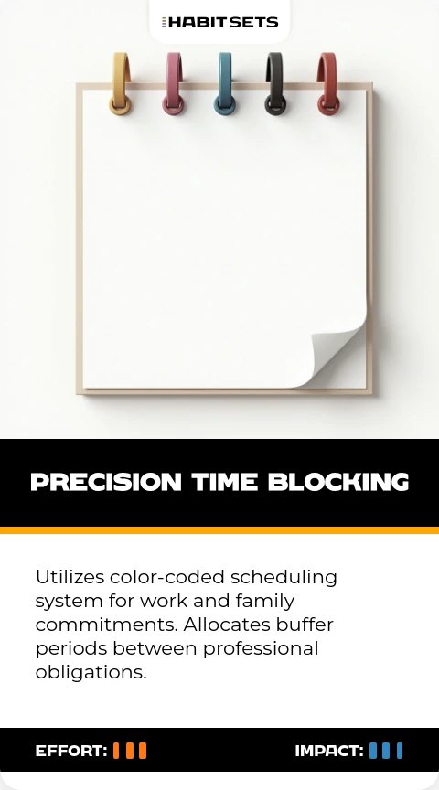 Utilizes color-coded scheduling system for work and family commitments. Allocates buffer periods between professional obligations.