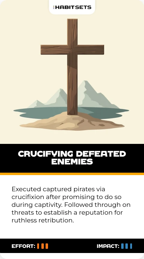 Executed captured pirates via crucifixion after promising to do so during captivity. Followed through on threats to establish a reputation for ruthless retribution.