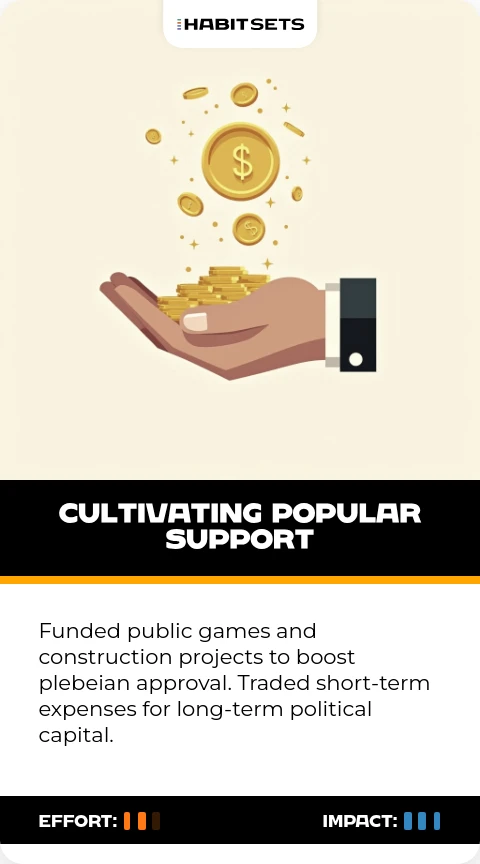 Funded public games and construction projects to boost plebeian approval. Traded short-term expenses for long-term political capital.