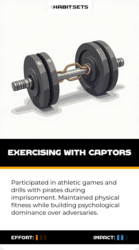 Participated in athletic games and drills with pirates during imprisonment. Maintained physical fitness while building psychological dominance over adversaries.