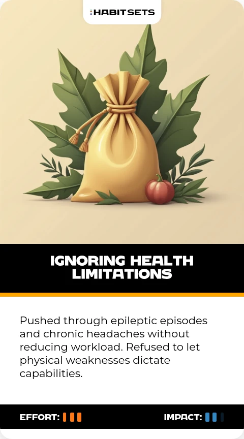 Pushed through epileptic episodes and chronic headaches without reducing workload. Refused to let physical weaknesses dictate capabilities.
