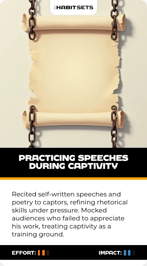 Recited self-written speeches and poetry to captors, refining rhetorical skills under pressure. Mocked audiences who failed to appreciate his work, treating captivity as a training ground.