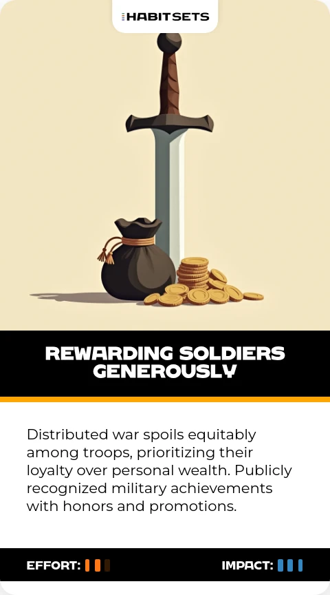 Distributed war spoils equitably among troops, prioritizing their loyalty over personal wealth. Publicly recognized military achievements with honors and promotions.