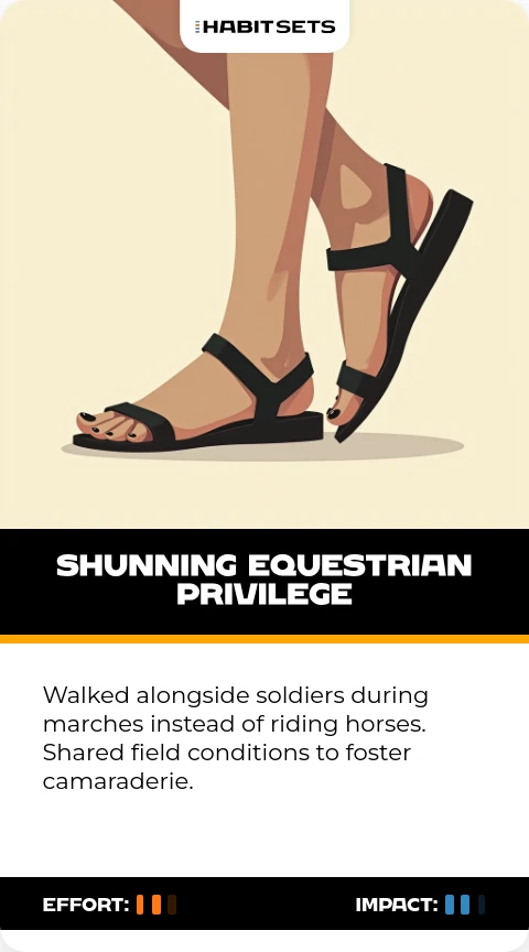 Walked alongside soldiers during marches instead of riding horses. Shared field conditions to foster camaraderie.