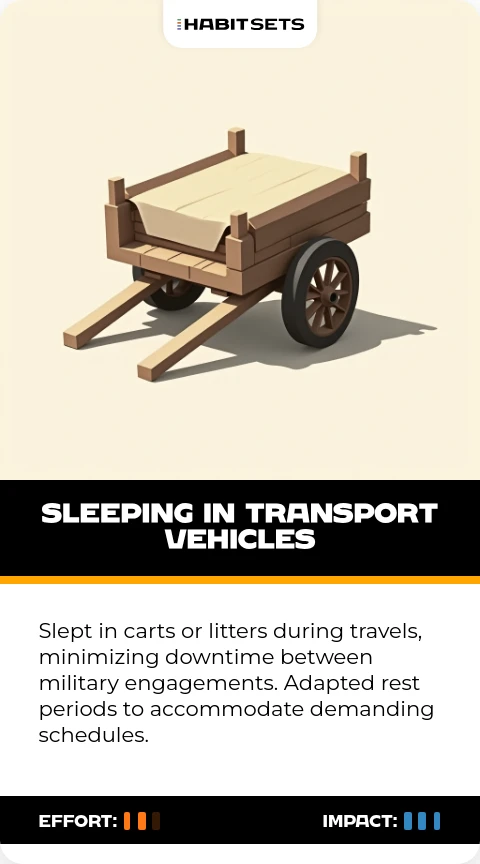 Slept in carts or litters during travels, minimizing downtime between military engagements. Adapted rest periods to accommodate demanding schedules.