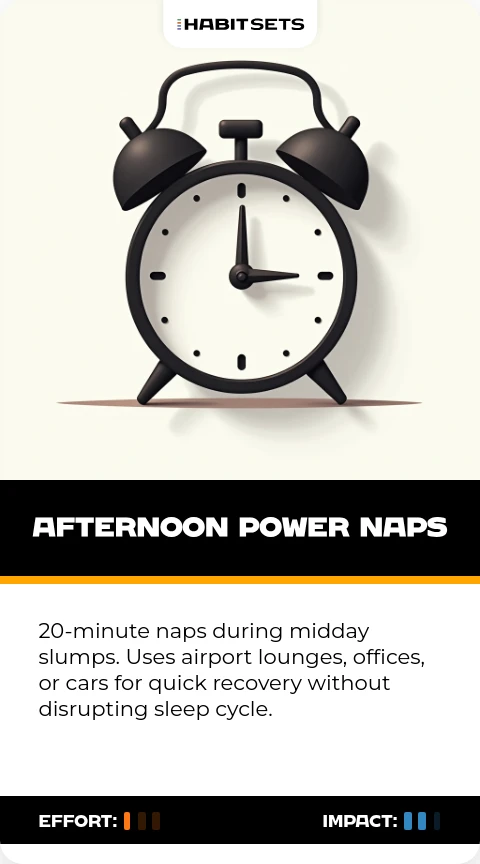 20-minute naps during midday slumps. Uses airport lounges, offices, or cars for quick recovery without disrupting sleep cycle.