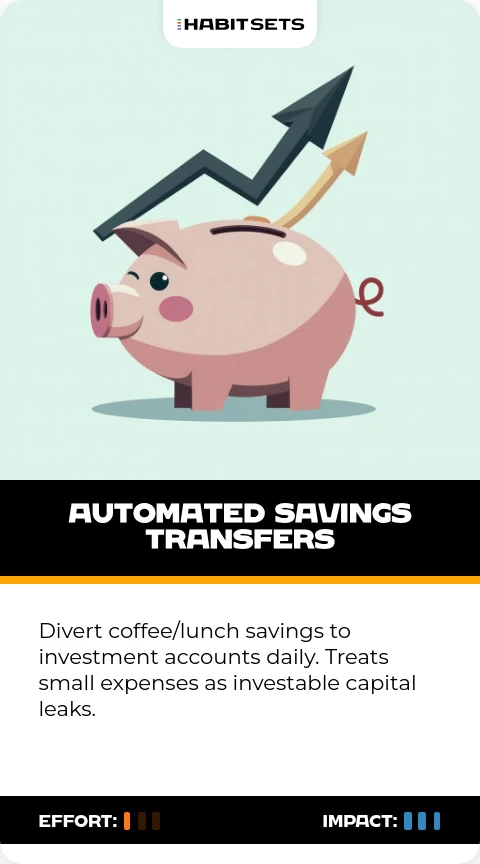 Divert coffee/lunch savings to investment accounts daily. Treats small expenses as investable capital leaks.