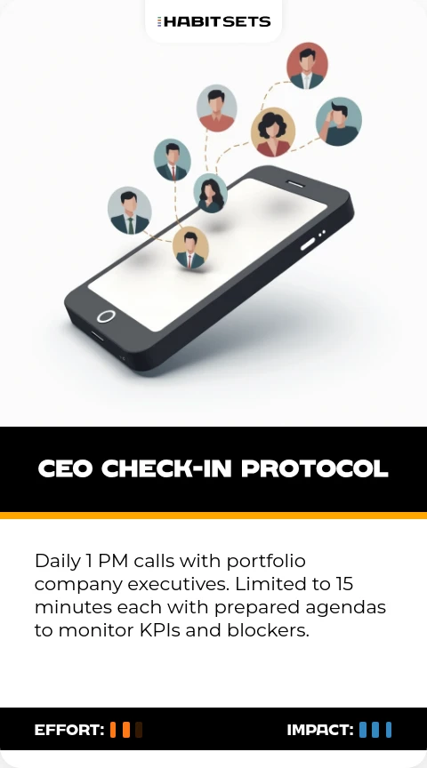 Daily 1 PM calls with portfolio company executives. Limited to 15 minutes each with prepared agendas to monitor KPIs and blockers.