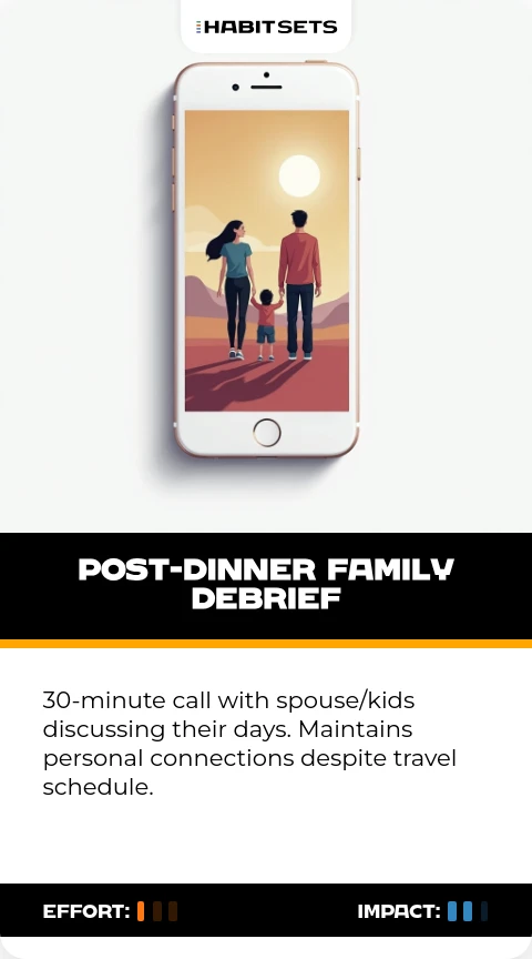 30-minute call with spouse/kids discussing their days. Maintains personal connections despite travel schedule.