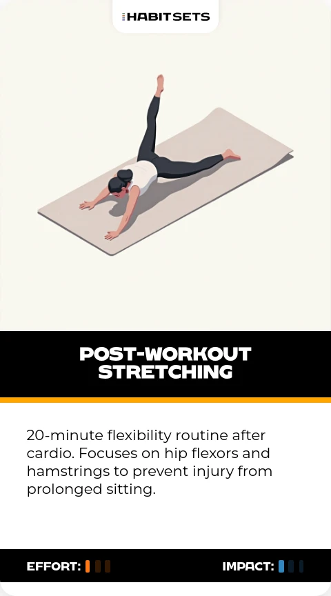 20-minute flexibility routine after cardio. Focuses on hip flexors and hamstrings to prevent injury from prolonged sitting.