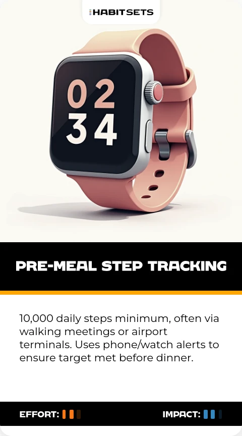 10,000 daily steps minimum, often via walking meetings or airport terminals. Uses phone/watch alerts to ensure target met before dinner.