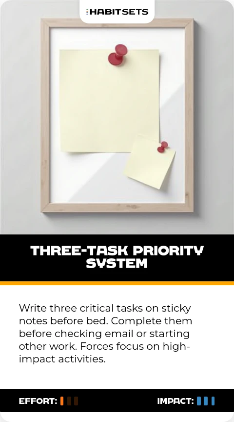 Write three critical tasks on sticky notes before bed. Complete them before checking email or starting other work. Forces focus on high-impact activities.