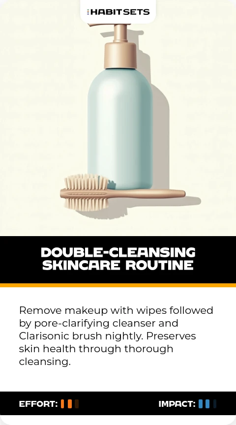 Remove makeup with wipes followed by pore-clarifying cleanser and Clarisonic brush nightly. Preserves skin health through thorough cleansing.