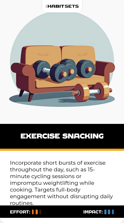 Incorporate short bursts of exercise throughout the day, such as 15-minute cycling sessions or impromptu weightlifting while cooking. Targets full-body engagement without disrupting daily routines.
