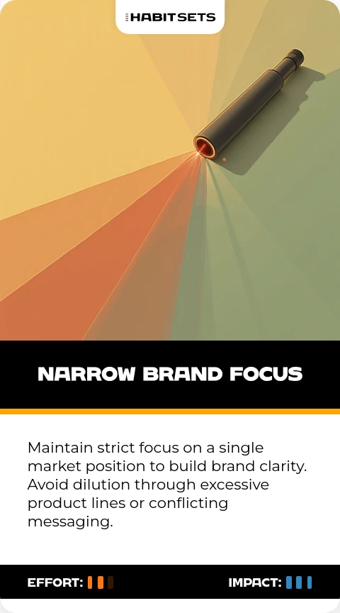 Maintain strict focus on a single market position to build brand clarity. Avoid dilution through excessive product lines or conflicting messaging.