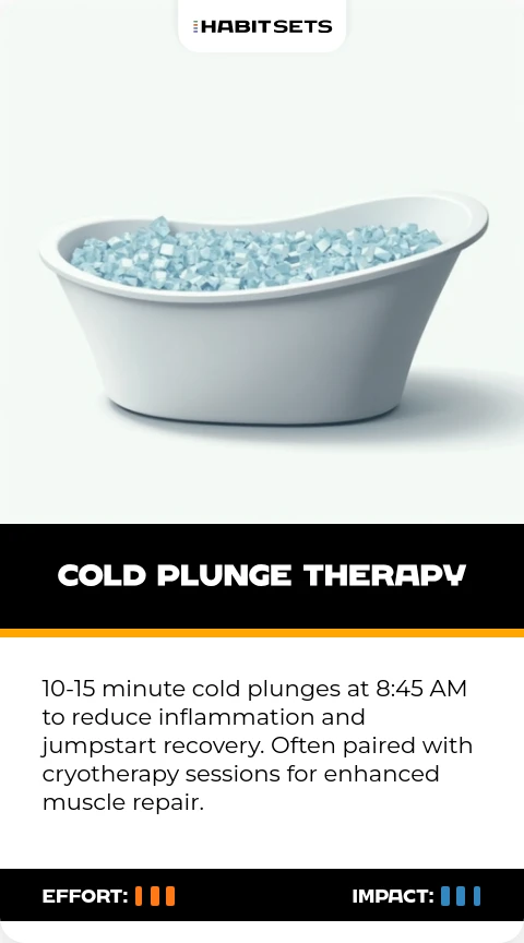 10-15 minute cold plunges at 8:45 AM to reduce inflammation and jumpstart recovery. Often paired with cryotherapy sessions for enhanced muscle repair.