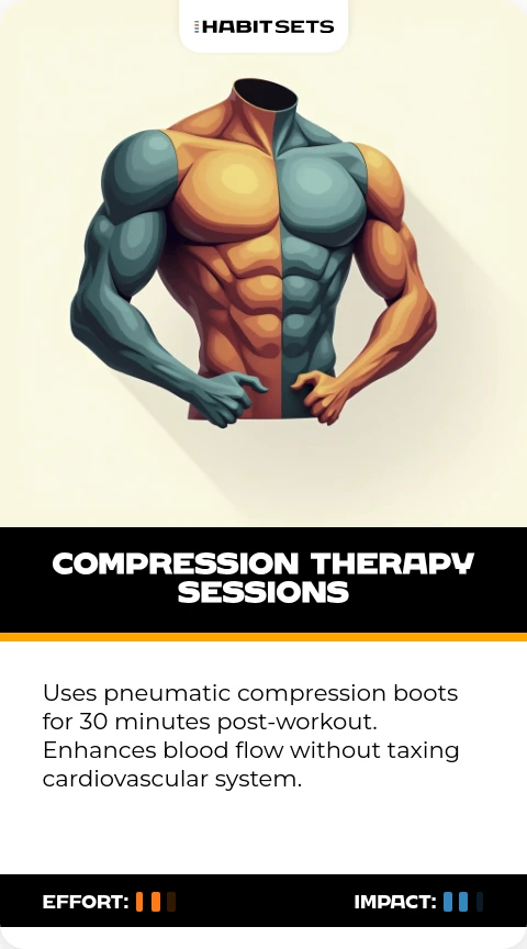 Uses pneumatic compression boots for 30 minutes post-workout. Enhances blood flow without taxing cardiovascular system.