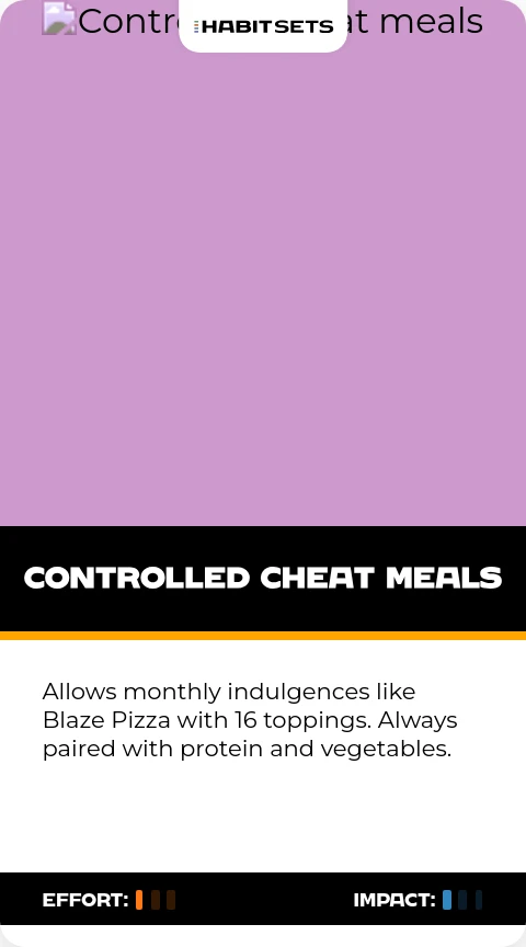 Allows monthly indulgences like Blaze Pizza with 16 toppings. Always paired with protein and vegetables.