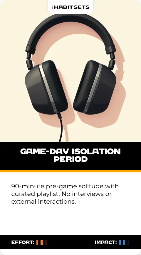 90-minute pre-game solitude with curated playlist. No interviews or external interactions.