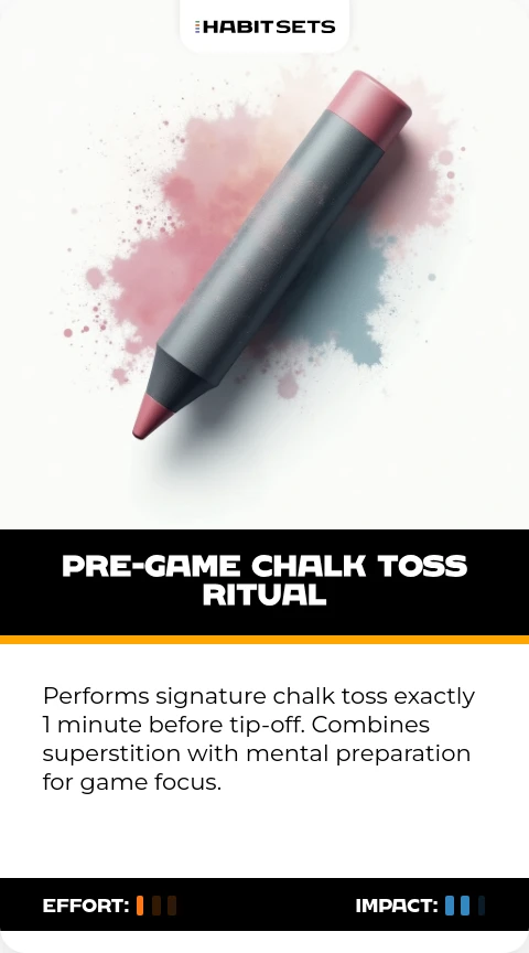 Performs signature chalk toss exactly 1 minute before tip-off. Combines superstition with mental preparation for game focus.