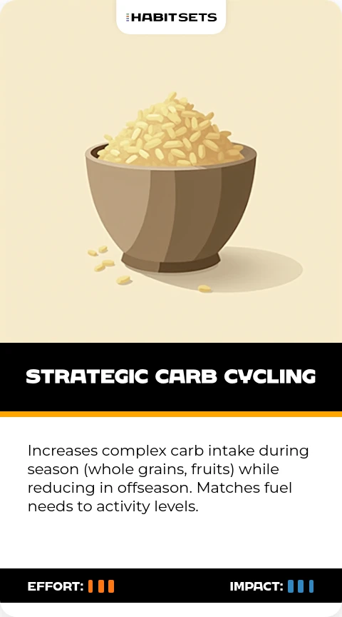Increases complex carb intake during season (whole grains, fruits) while reducing in offseason. Matches fuel needs to activity levels.