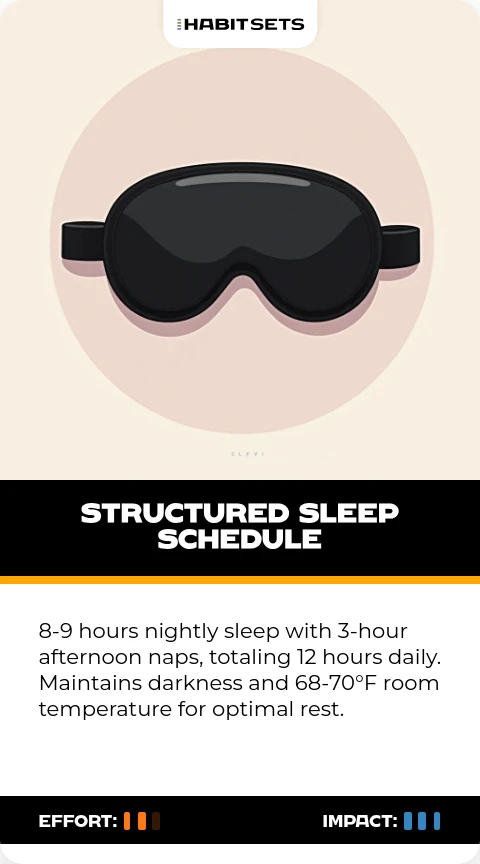 8-9 hours nightly sleep with 3-hour afternoon naps, totaling 12 hours daily. Maintains darkness and 68-70°F room temperature for optimal rest.