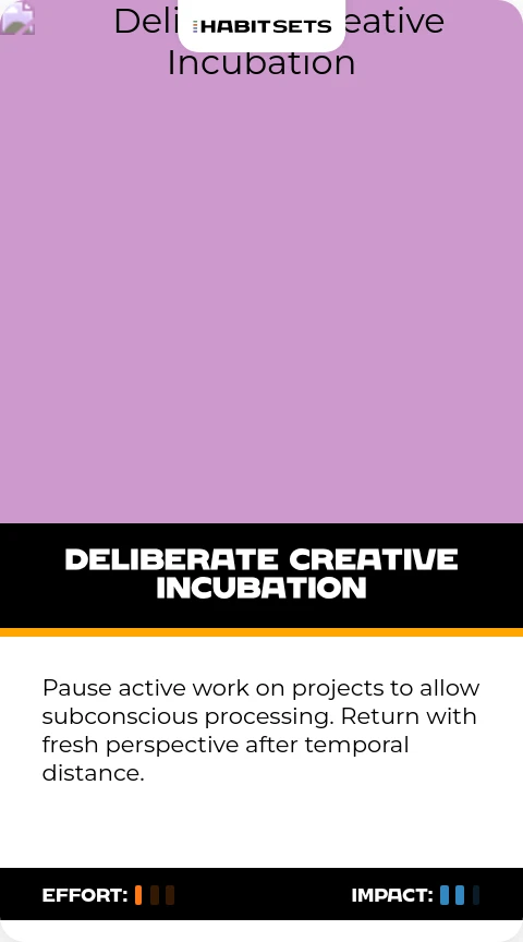 Pause active work on projects to allow subconscious processing. Return with fresh perspective after temporal distance.