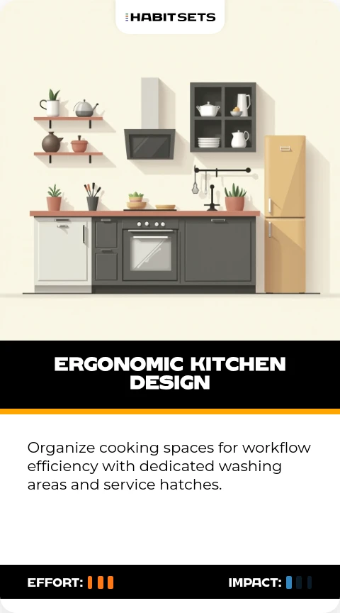 Organize cooking spaces for workflow efficiency with dedicated washing areas and service hatches.