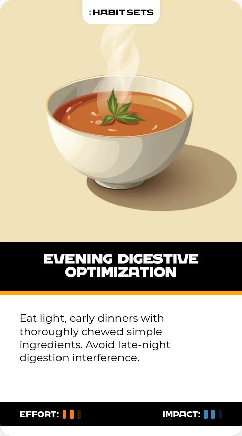 Eat light, early dinners with thoroughly chewed simple ingredients. Avoid late-night digestion interference.